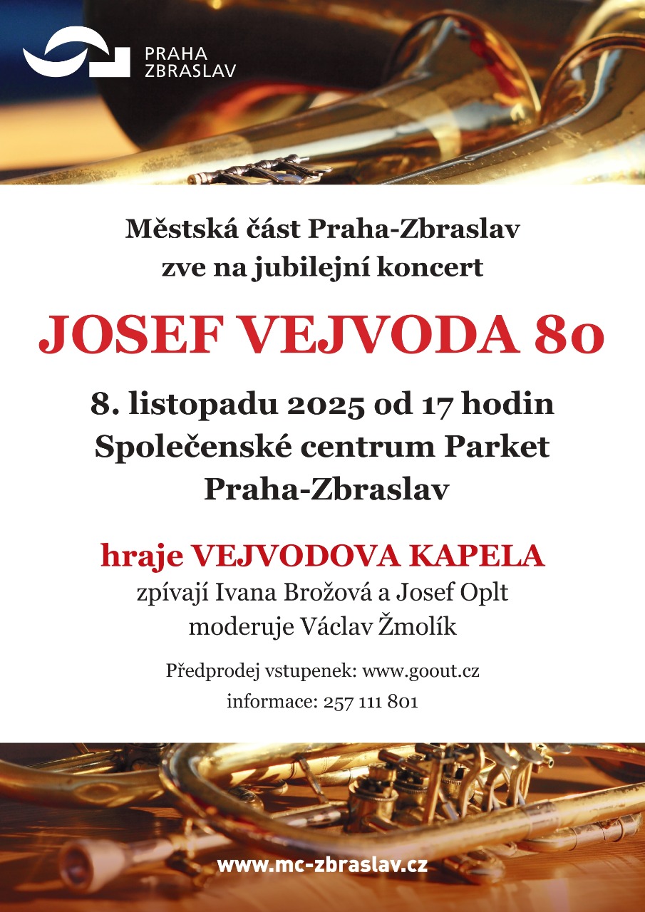 Pozvánka na jubilejní koncert Jaromír Vejvoda 80 16.10.2025 10:53 Srdečně zveme na jubilejní koncert s názvem Jaromír Vejvoda 80, který se uskuteční ve Společenském centru Parket Sokola Zbraslav dne 8.11. od 17h. Vstupenky koupíte ZDE
